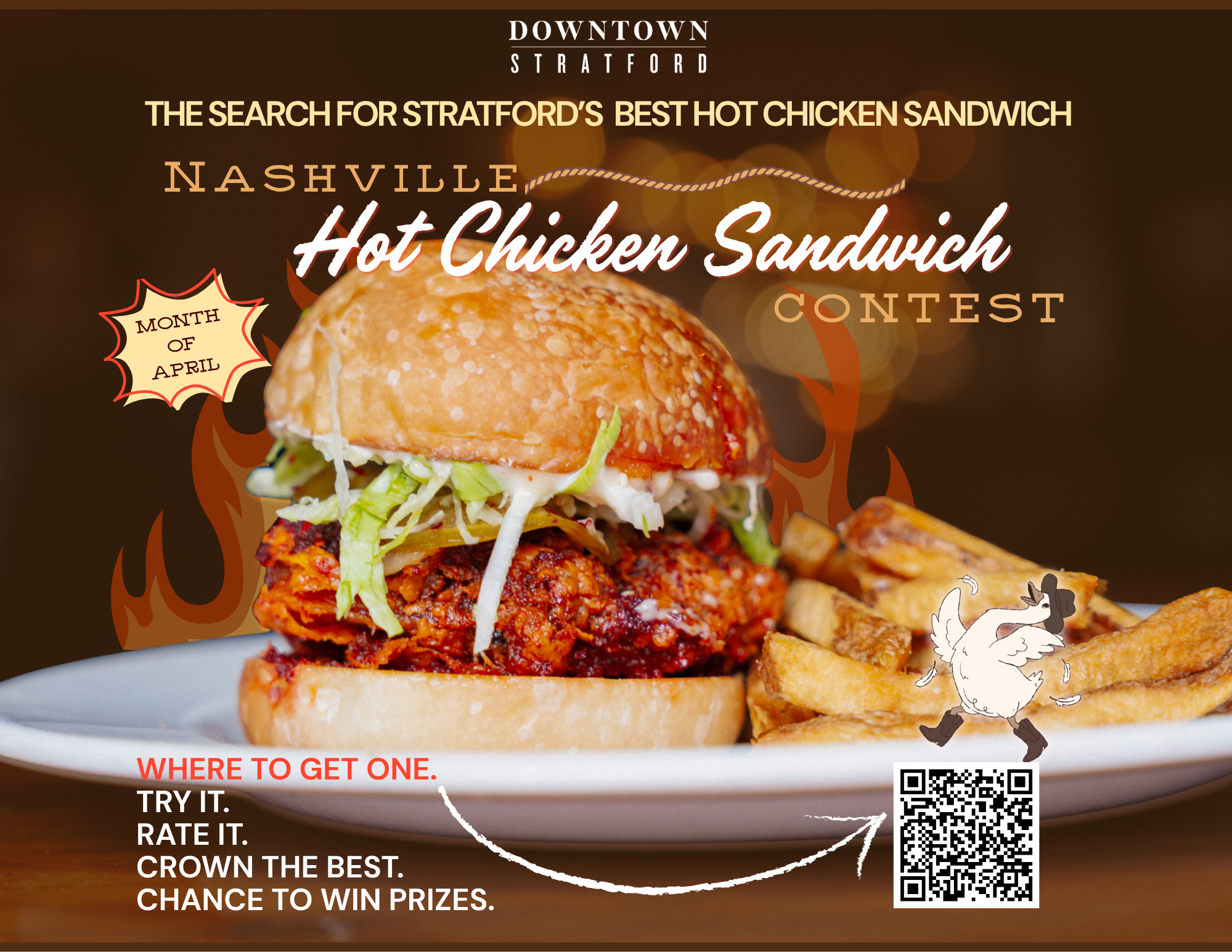 Downtown Stratford, THE WHOLE MONTH OF APRIL! To celebrate The Nashville Takeover mid-April, several restaurants downtown are participating in a Nashville Hot Chicken Sandwich Contest! It’s on YOU to help decide which restaurant has THE...