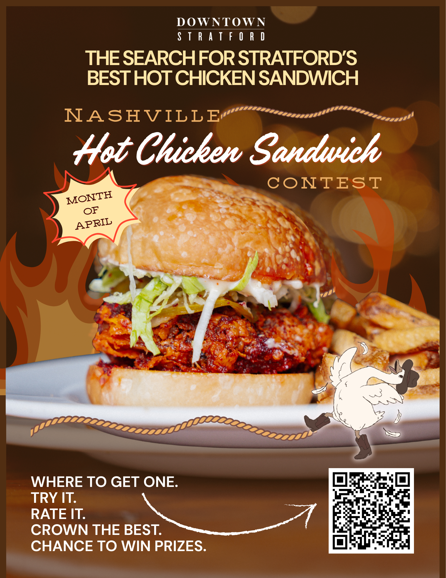 Along with your order of the “Nashville Hot Chicken Sandwich” your server will provide the card above for you to access the survey via the QR code. The winning resto stands to win some downtown dollars, but guess what… so do YOU! For every survey entry your name will be put into a draw. Winners will be contacted the start of May. Hope you enjoy a honky tonk time the month of April!